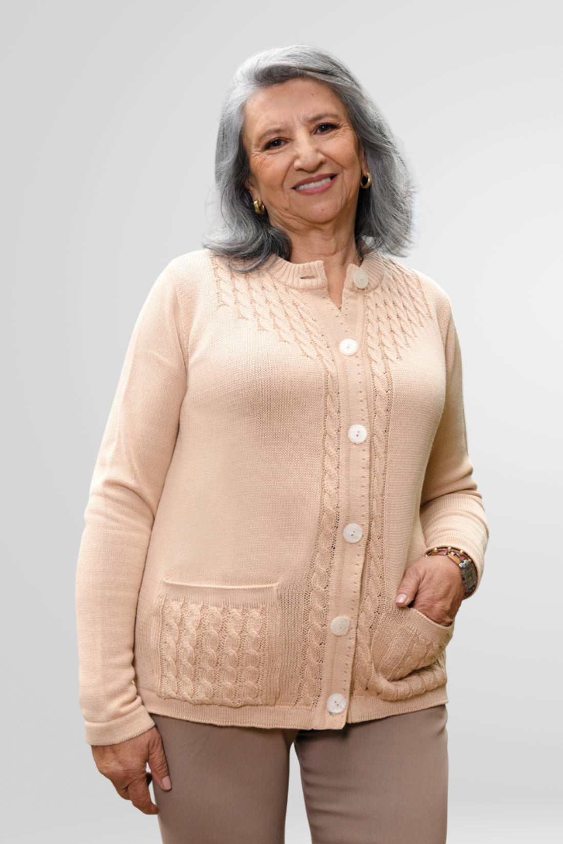 El Saco Dorotea combina elegancia y comodidad en una prenda clásica imprescindible. Destaca por su delicado tejido de ocho en la parte frontal y en los bolsillos, que añade un toque de textura y sofisticación. Su diseño de botones grandes facilita su uso y ofrece un ajuste práctico para el día a día. Ideal para complementar tus looks casuales o de oficina, este Saco de talla única se adapta con naturalidad a distintas siluetas, brindando confort y estilo atemporal.