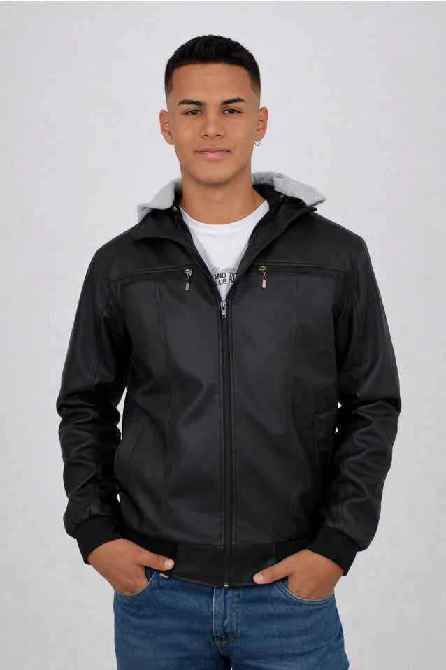 😎 El Look en Capas Perfecto (2-en-1): Es la fusión definitiva. Te da el estilo de una chaqueta tipo cuero sobre una sudadera con capucha (hoodie) en una sola prenda ligera, cómoda y funcional.